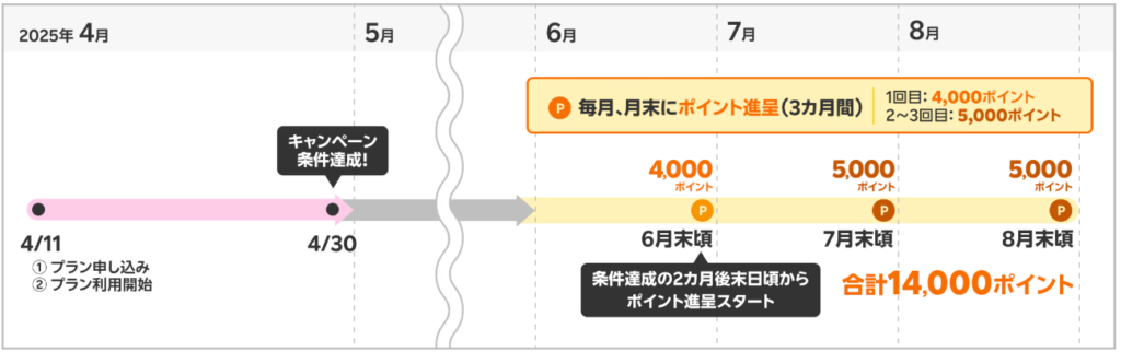 | 還元時期 | 開通の翌々月末から3ヶ月に渡ってポイント付与 | |