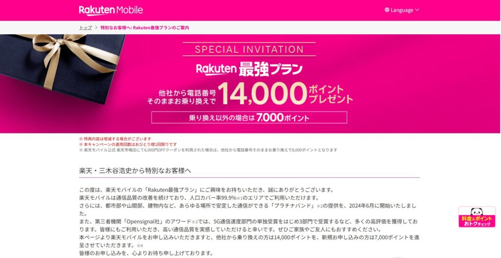 >>必ずこの専用ページからアクセス(楽天モバイル三木谷キャンペーン特設ページ)